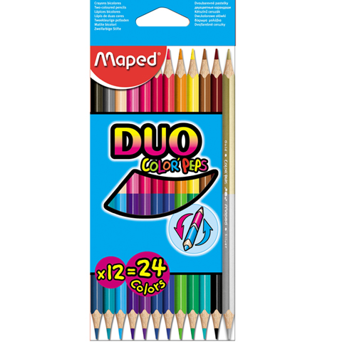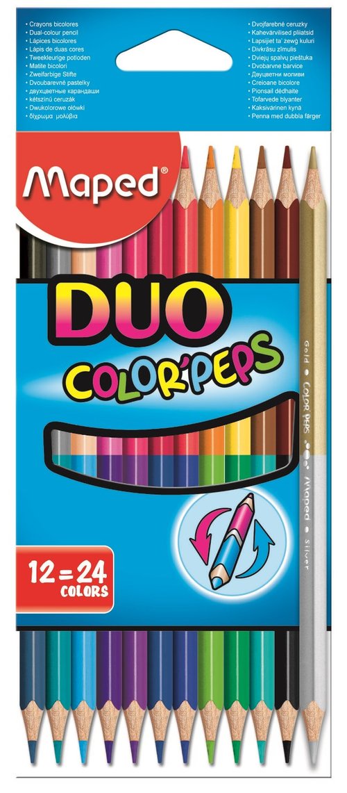 Kredki dwustronne COLOR'PEPS 12 szt = 24 kolory, wykonane z drewna lipowego, trójkątny przekrój, intensywne kolory, grafit o przekroju 2,9 mm. Pakowane w kartonowe etui. JS 1 etui.