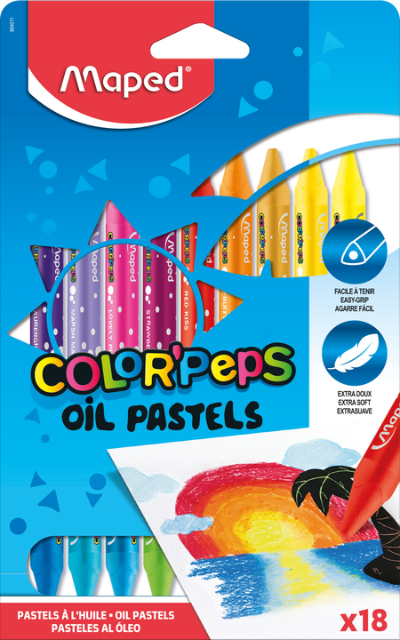 Pastele olejne w postaci klasycznych sztyftów o trójkątnym przekroju. Nadają się do rysowania na papierze, kartonie, tekturze, płótnie i innych powierzchniach. Zaostrzony koniec kredki dedykowany do rysowania a boczna część pastela do malowania. Możliwe malowanie różnymi technikami w zależności od pożądanych efektów: wydrapywanie jednej lub wielu warstw przy użyciu odpowiedniego narzędzia, nakładanie dwóch lub więcej kolorów na siebie dla uzyskania efektu wymieszanych kolorów, różnicowanie siły nakładanego koloru dla uzyskania różnych odcieni koloru, rozcieranie pasteli i tworzenie smug na rysunku aby poszczególne partie wydawały się równo pokolorowane. Długość kredki 7,6 cm , przekrój 1,1 cm. Wysuwanie pudełko 18 szt.