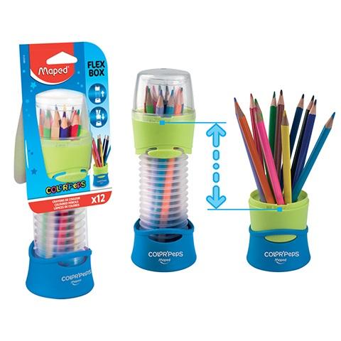 Kredki COLOR'PEPS 12 szt wykonane z drewna lipowego, trójkątny przekrój, intensywne kolory, grafit o przekroju 2,9 mm. Pakowane w plastikowy pojemnik, którego wysokość można regulować w zależności od zmieniającej się długości temperowanych kredek.