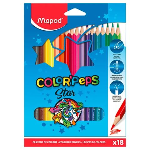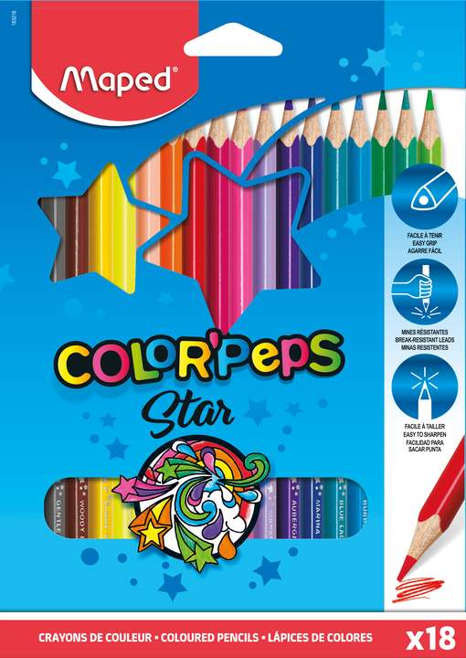 Kredki COLOR'PEPS 18 szt wykonane z drewna lipowego, trójkątny przekrój, intensywne kolory, grafit o przekroju 2,9 mm. Pakowane w kartonowe etui.