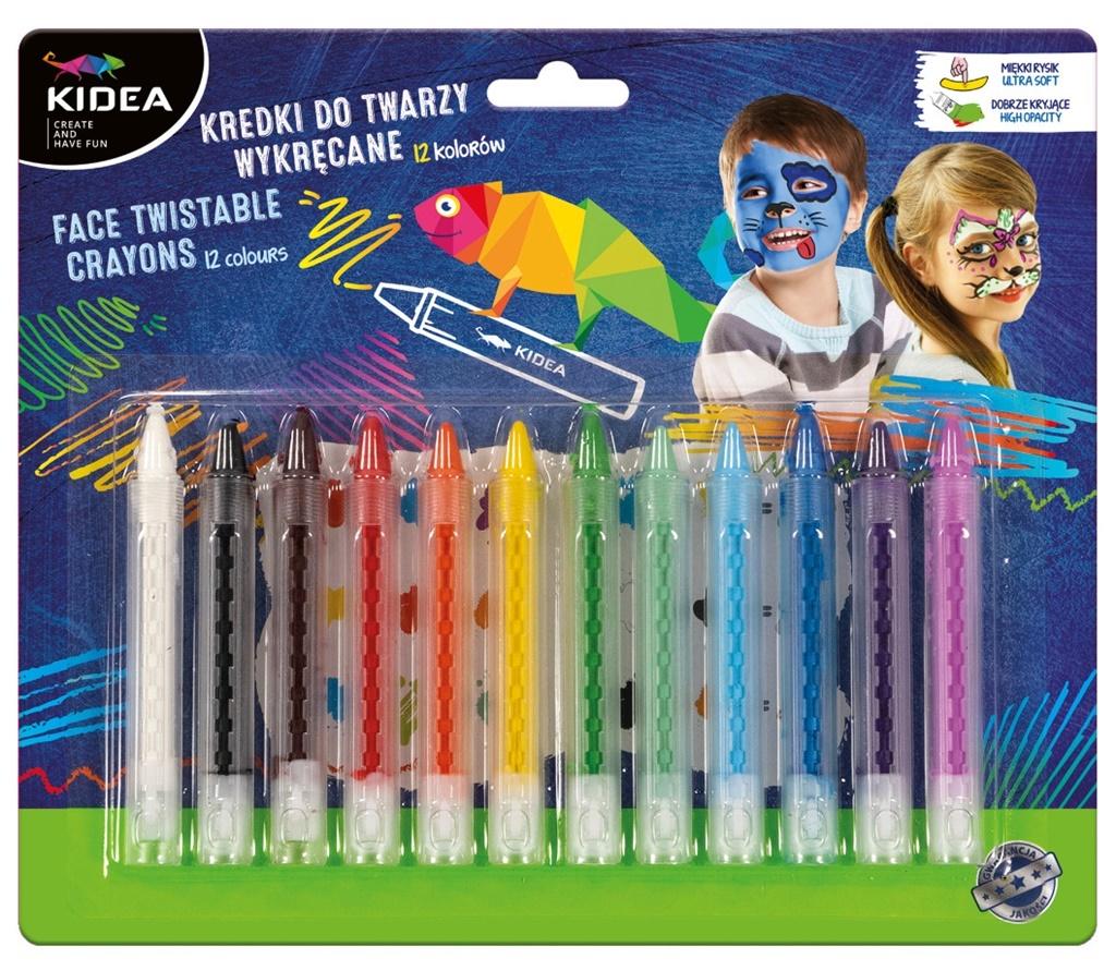 Kredki do twarzy w dwunastu wyrazistych kolorach, które dzięki swojej miękkości doskonale sprawdzają się w precyzyjnym rysowaniu kreatywnych rysunków na skórze. Ich wygodny mechanizm wykręcania dodatkowo uatrakcyjnia produkt i pozwala na wygodne korzystanie. Kredki są bezpieczne w użytkowaniu, co potwierdzają przeprowadzone testy dermatologiczne. Posiadają ergonomiczny kształt, dzięki czemu idealnie pasują do rączki każdego dziecka.