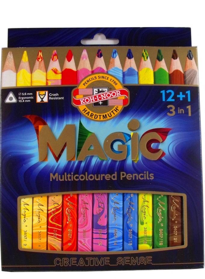 MAGIC TRIO KOH-I-NOOR kredki z efektownym wielokolorowym wkładem. Umożliwiają tworzenie efektownych i niepowtarzalnych prac. Użycie w kredce wkładu trzech odcieni jednego koloru powoduje, że rysunek nabiera charakteru przestrzennego (efekt 3D). Kolor kreski zmienia się w zależności od obrotu, nachylenia, kierunku rysowania i zużycia kredki. Dysponują intensywnymi kolorami, a miękki wkład sprawia, że łatwo się nimi rysuje. Duża średnica wkładu (5,6mm) zapewnia odporność na silny nacisk i złamanie, a gruba trójkątna oprawka (10 mm)wymusza prawidłowe ergonomiczne trzymanie kredki. Do kredek dołączany jest blender, jest to bezbarwna kredka służąca do rozcierana, rozmazywania śladu prowadzenia kredki i mieszania kolorów. Zestaw zawiera 12 szt kredek i blender.