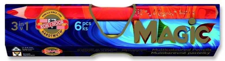 Grubae kredki z efektownym wielokolorowym wkładem. Umożliwiają tworzenie efektownych i niepowtarzalnych prac. Kolor kreski zmienia się w zależności od obrotu, nachylenia i zużycia kredki.