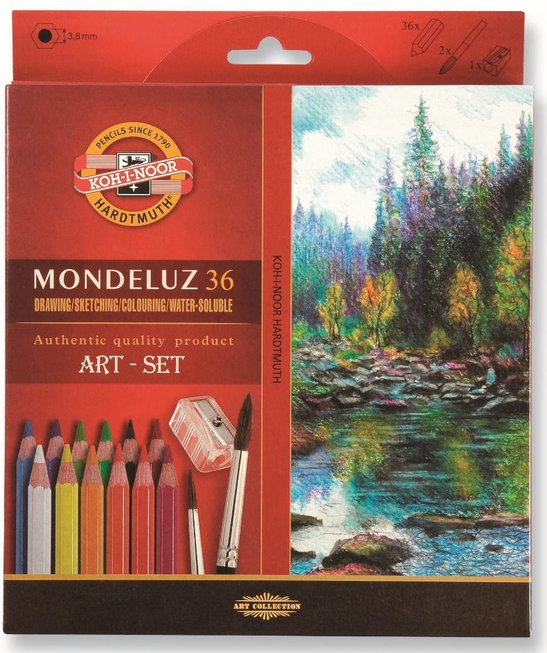 Profesjonalne kredki akwarelowe oprawione w wysokiej jakości drewno cedrowe. Można je używać podobnie jak ze zwykłe kredki lub też wykorzystać ich walory akwareli, czyli za pomocą wilgotnego pędzelka rozmywać w dowolnym miejscu rysunek. Naniesioną kredkę można całkowicie rozprowadzić pędzlem po rysunku, lub tylko częściowo pozostawiając linie, kontury, kreski. Dzięki wieloletniemu doświadczeniu i starannemu wykonaniu KOH-I-NOOR kredki Mondeluz są odporne na zawilgocenie i zachowują swoje walory. Do nabycia w zestawach kolorów w pudełkach tekturowych i metalowych, na sztuki, oraz zestawach z temperówką i pędzelkami.