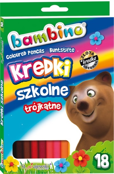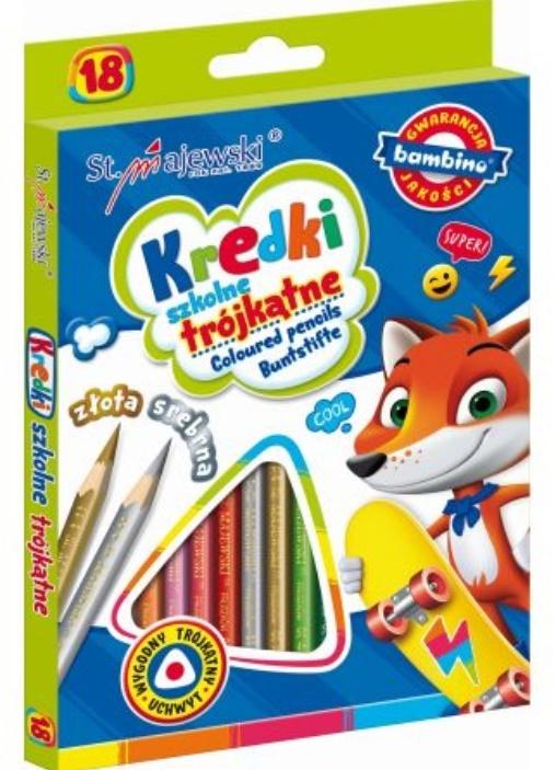 Ergonomiczne kredki ołówkowe o trójkątnym przekroju. Idealnie dopasowują się do małej dłoni dziecka. Bogata gama kolorów, w tym kredka złota i srebrna. Kredki szkolne wyróżnia wysoka jakość.