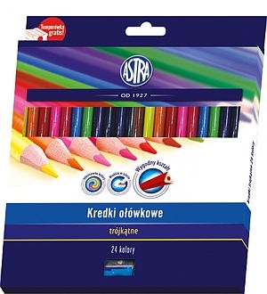 ASTRA VISION to seria kredek o doskonałej jakości. Kredki są miękkie w użyciu, nie pylą i nie rozmazują się. Z łatwością się temperują. Mają wyraziste kolory i atrakcyjny design. W ofercie dostępne są kredki heksagonalne, trójkątne oraz trójkątne jumbo odpowiednie również dla dzieci leworęcznych. Kredki w zestawie z temperówką.