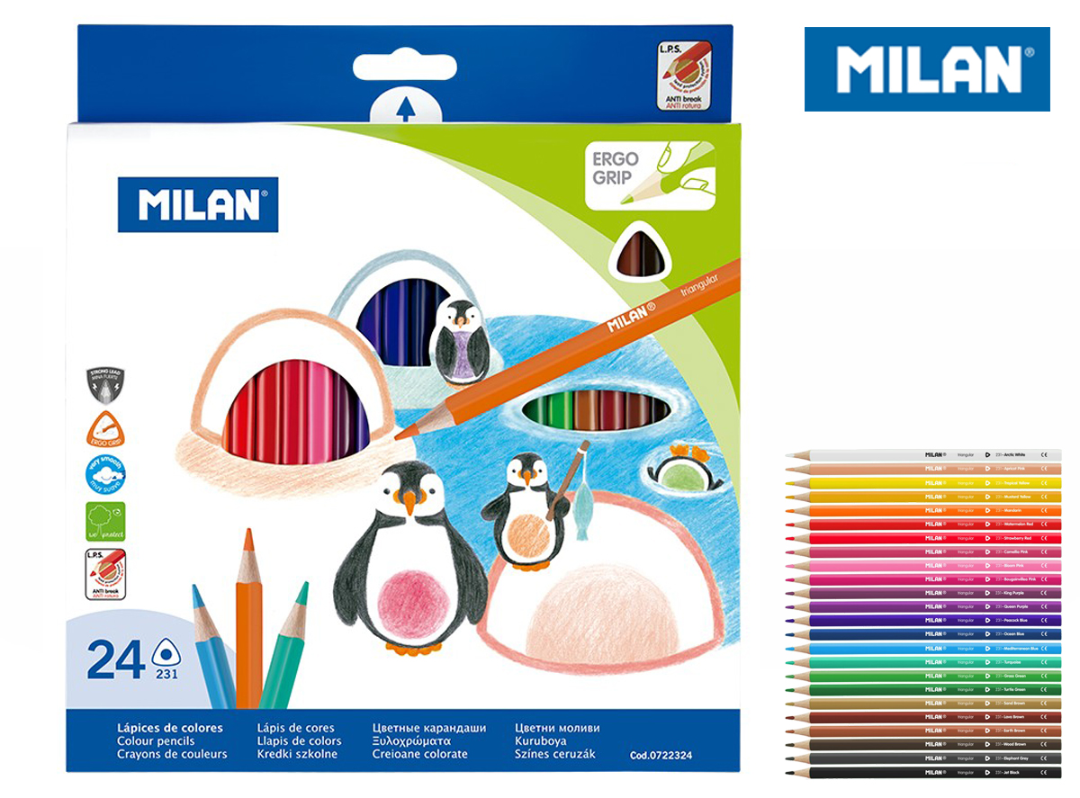 Kredki ołówkowe trójkątne. System ochrony rysika LPS zwiększający odporność na złamanie.Wysokiej jakości pigmenty w żywych, intensywnych kolorach, odporne na działanie światła. Kreska wykonana kredką MILAN jest miękka, jednolita o wyraźnym odcieniu. Nie tworzy rowków ani nie niszczy papieru.