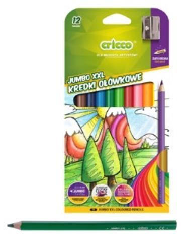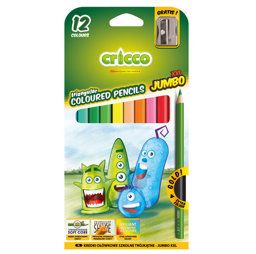 Kredki ołówkowe grube, 12 kolorów o trójkątnym kształcie. Ergonomiczny kształt umożliwia pewne trzymanie i ułatwia rysowanie. Miękki wzmocniony grafit ułatwia kolorowanie. Lakierowanie obwoluty kredek zgodnie z kolorem grafitu. Wszystkie kredki oryginalnie zatemperowane i gotowe do użycia. Pakowane w kolorowe kartoniki z okienkiem i zawieszką. W każdym pudełku temperówka i złota kredka.