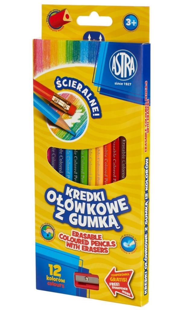 12 kredek ołówkowych w intensywnych kolorach. Ścieralne o wyrazistych kolorach, miękkie w użyciu, łatwe w temperowaniu. Nie pylą, nie kruszą się. Doskonała jakość. Temperówka gratis.