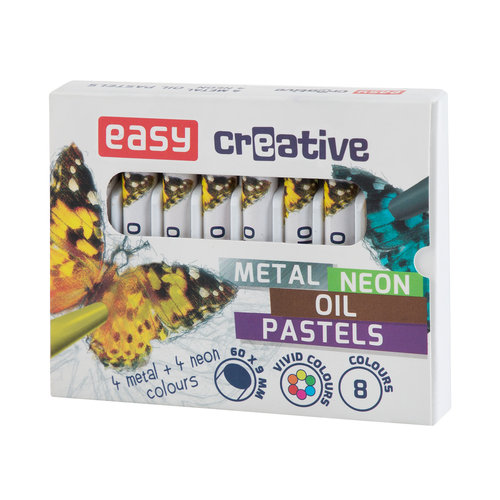 Gama 8 kolorów pomaga tworzyć wspaniałe dzieła, jak również pozwala na pierwsze eksperymenty z mieszaniem i zestawianiem barw. Szczególny zestaw pasteli neonowych i metalicznych urozmaici dzieła i nada im zupełnie nowego charakteru.