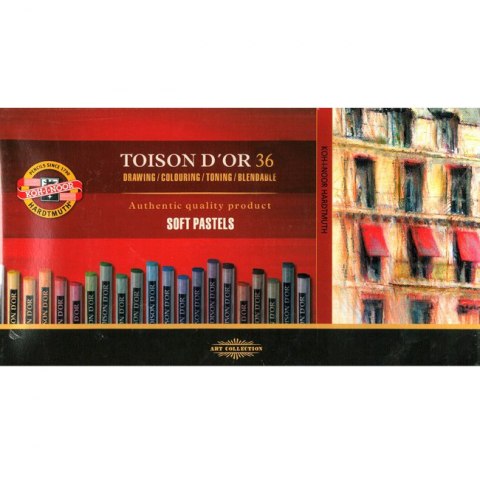 Pastele suche TOISON D'OR odznaczają się paletą trwałych kolorów i jednolitością pigmentu w masie pasteli. Są bardzo kruche i delikatne, dzięki czemu świetnie się rozcierają, a przez co są bardzo podatne na złamania. Do rysowania pastelą zalecane jest używanie papieru z fakturą, gdyż łączy się z podłożem tylko w sposób mechaniczny (mikro zagłębienia w fakturze papieru). Dlatego po ukończeniu pracę należy zabezpieczyć fiksatywą lub przykryć szybą. Komplet 36 kolorów.