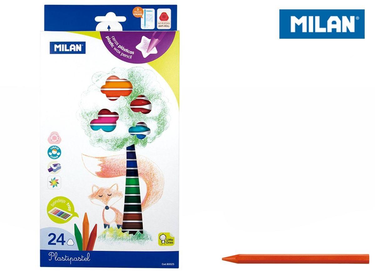 Kredki woskowe PLASTIPASTEL to mieszanka wosku, pigmentu i tworzywa termoplastycznego. Wytrzymała i miękka. Ergonomiczny, trójkątny kształt dostosowuje się idealnie do ręki dziecka i pomaga w wykonywaniu rysunków. Można nią rysować zarówno cienkie, jak i grube linie oraz zamalowywać większe przestrzenie całą powierzchnią kredki. Kredka jest bezwonna i nie brudzi rąk dzięki specjalnej konsystencji. Można ją zatemperować za pomocą każdej temperówki. Wymiary: długość 12 cm, średnica 7 mm. Kredki MILAN są zgodne z europejskimi i amerykańskimi normami bezpieczeństwa. Nie zawierają ftalanów, metali ciężkich i innych substancji toksycznych. Są bezpieczne dla dzieci.
