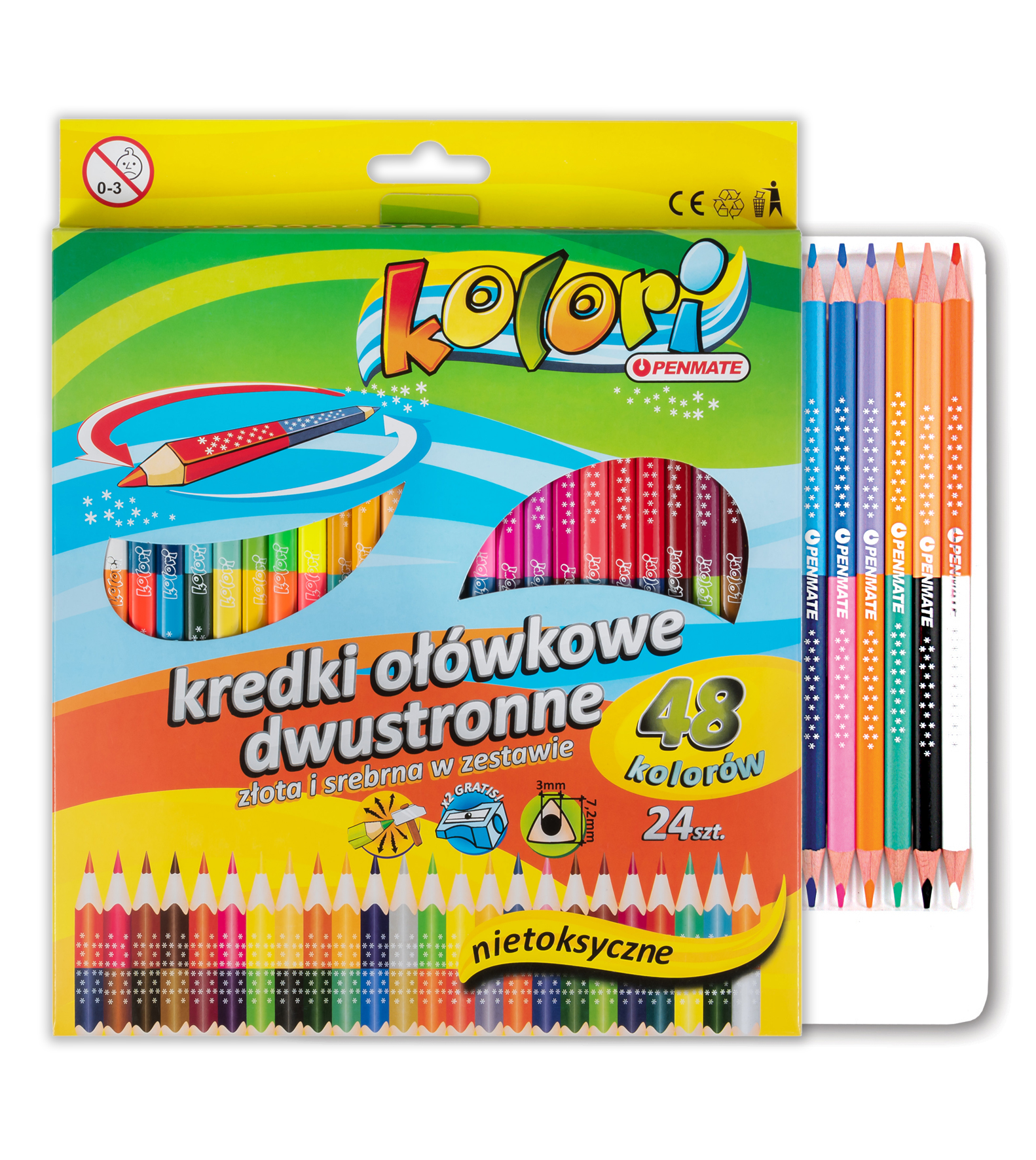 Komplet 24 sztuk kredek ołówkowych dwustronnych w trójkątnej obudowie. Zestaw zawiera 48 kolory w tym kredkę złotą i srebrną. Grafit o średnicy 3 mm i zwiększonej odporności na złamanie. Nowoczesna formuła pigmentów dająca żywe, niegasnące kolory. Obudowa wykonana z najwyższej jakości jasnego drewna lipowego, łatwego w temperowaniu. Nadruk na trzech płaszczyznach, końcówki kredek lakierowane metodą zanurzania. Foliowane, trwałe pudełko z tacką na kredki w środku. Temperówka w zestawie gratis. Nietoksyczne, zgodne z normą EN71.