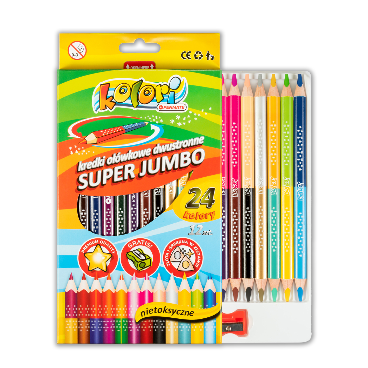 Kredki ołówkowe trójkątne, dwustronne. W zestawie 24 kolory w tym złoty i srebrny. Grafit o średnicy 5mm o zwiększonej odporności na złamania. Obudowa wykonana z nawyższej jakości drewna lipowego, łatwego w temperowaniu. Nadruk na trzech płaszczyznach obudowy. Kredki umieszczone w trwałym, kartonowym pudełku z tacką wewnątrz. Nietoksyczne, zgodne z normą EN-71.