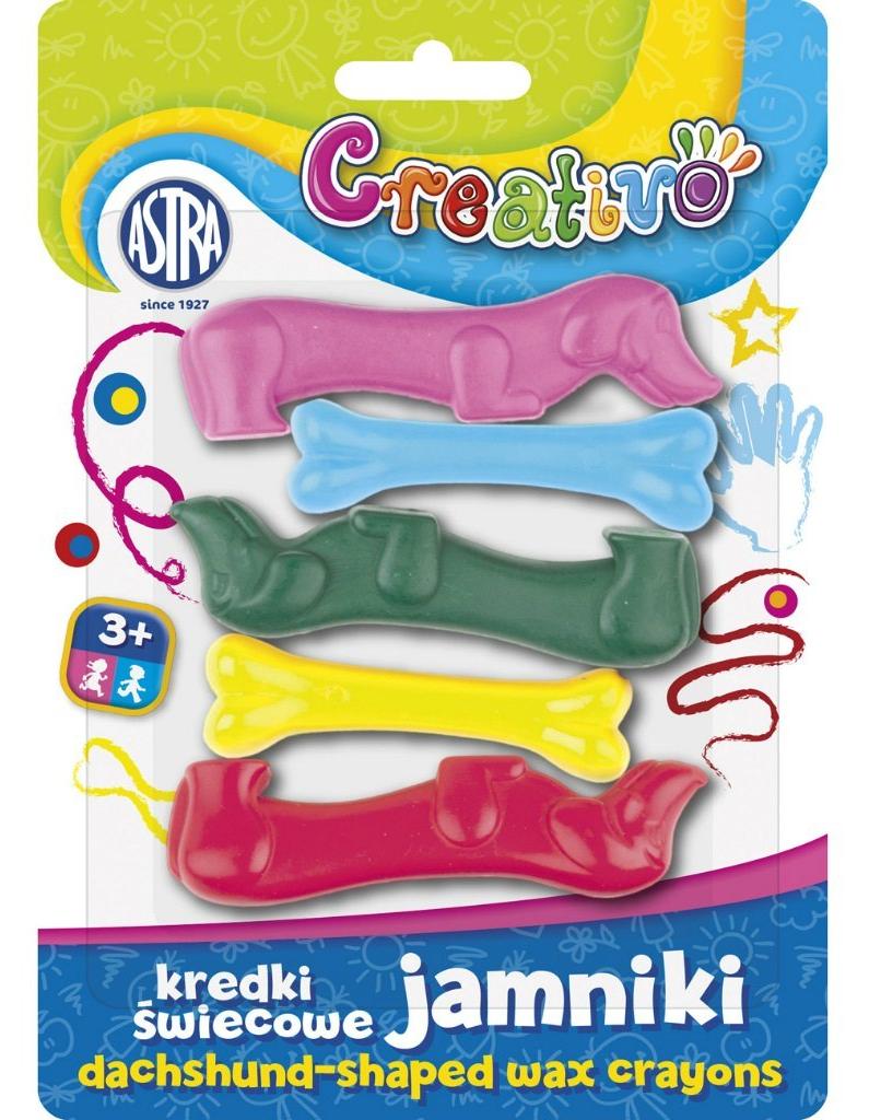 Kredki świecowe w kształcie jamników i kości w 5 różnych kolorach. Seria Astra Creativo.