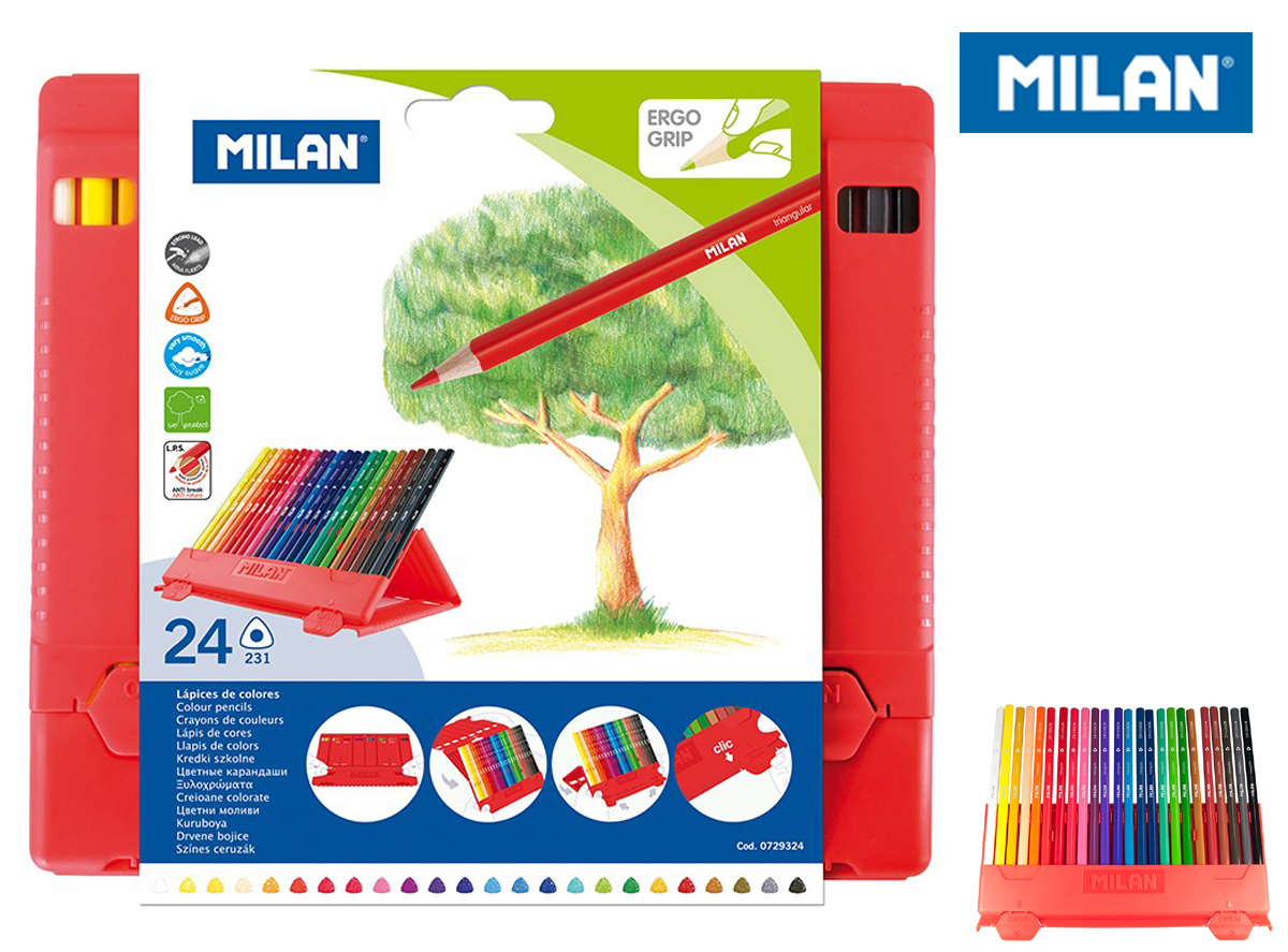 Kredki ołówkowe trójkątne. System ochrony rysika LPS zwiększający odporność na złamanie.Wysokiej jakości pigmenty w żywych, intensywnych kolorach, odporne na działanie światła. Kreska wykonana kredką MILAN jest miękka, jednolita o wyraźnym odcieniu. Nie tworzy rowków ani nie niszczy papieru. 24 kolorów w plastikowym opakowaniu. Po rozłożeniu otrzymujemy przybornik na biurko.