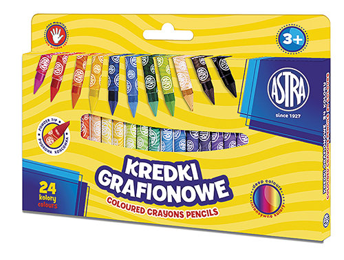 Kredki z glinki kaolinowej - 24 kolory. Żywe i intensywne kolory, doskonałe właściwości kryjące. Nie wymagają temperowania i nie brudzą rąk. Nadają się do rysowania na wszystkich rodzajach papieru.