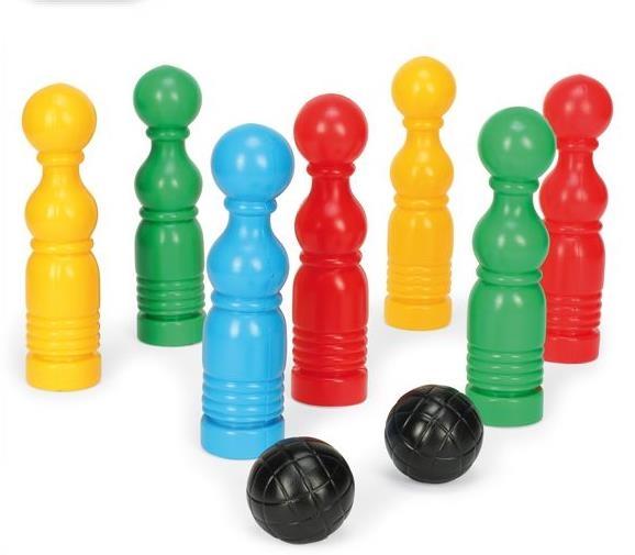 Zestaw składa się z 7 kolorowych kręgli i 2 czarnych kul. Kręgle są doskonałą formą spędzania wolnego czasu dla dziecka, ponieważ można grać w nie w pojedynkę lub w grupie, rozwijając przy tym zdolności manualne, koncentrację oraz precyzję.