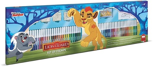 Pieczątki na licencji Króla Lwa. W skład zestawu wchodzą: 4 pieczątki, 1 poduszeczka do tuszu, 60 pisaków, 1 książeczka do kolorowania i 30 naklejek.