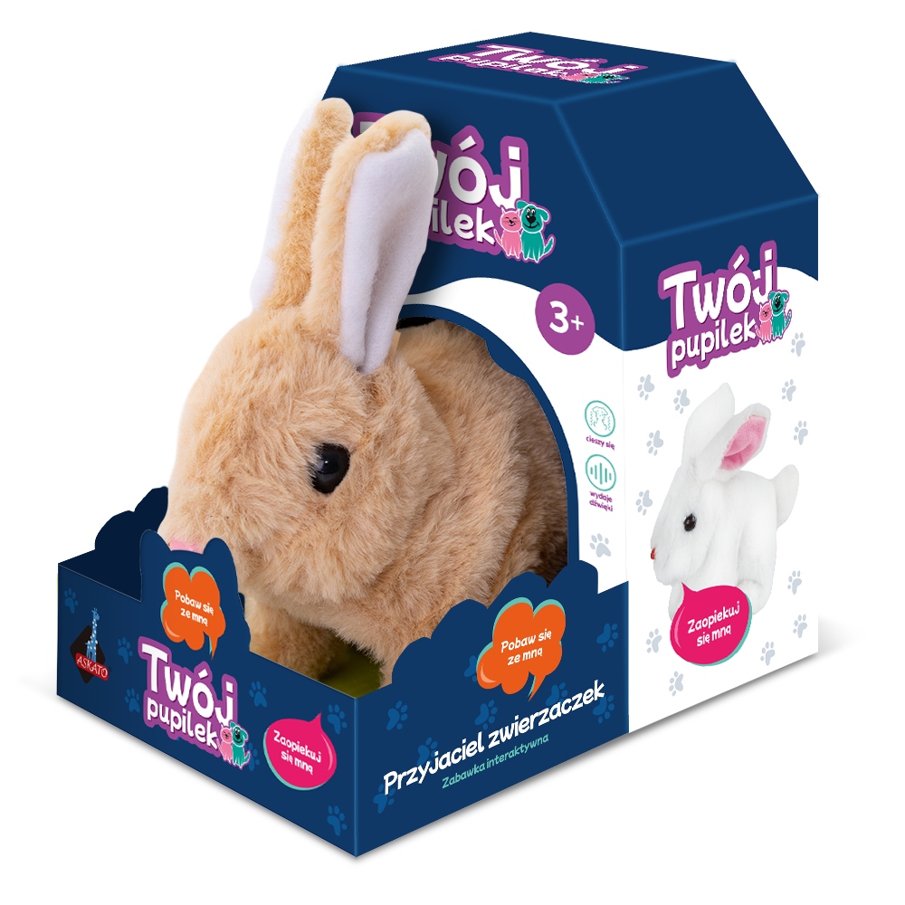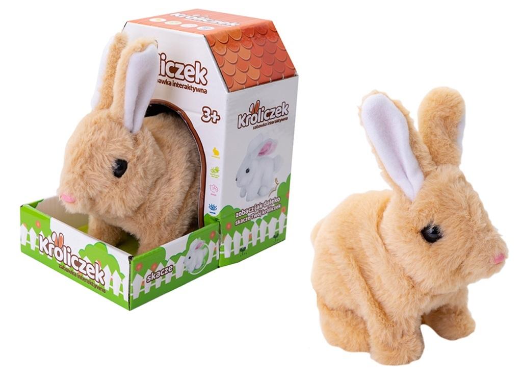 Interaktywny króliczek na pewno sprawi mnóstwo radości niejednemu dziecku, które marzy o własnym prawdziwym zwierzątku. Zabawka w całości jest pluszowa w brązowym kolorze z białymi uszkami. Króliczek kica do przodu wydając królicze odgłosy, rusza uroczo uszkami co sprawia, że przypomina prawdziwe zwierzątko.