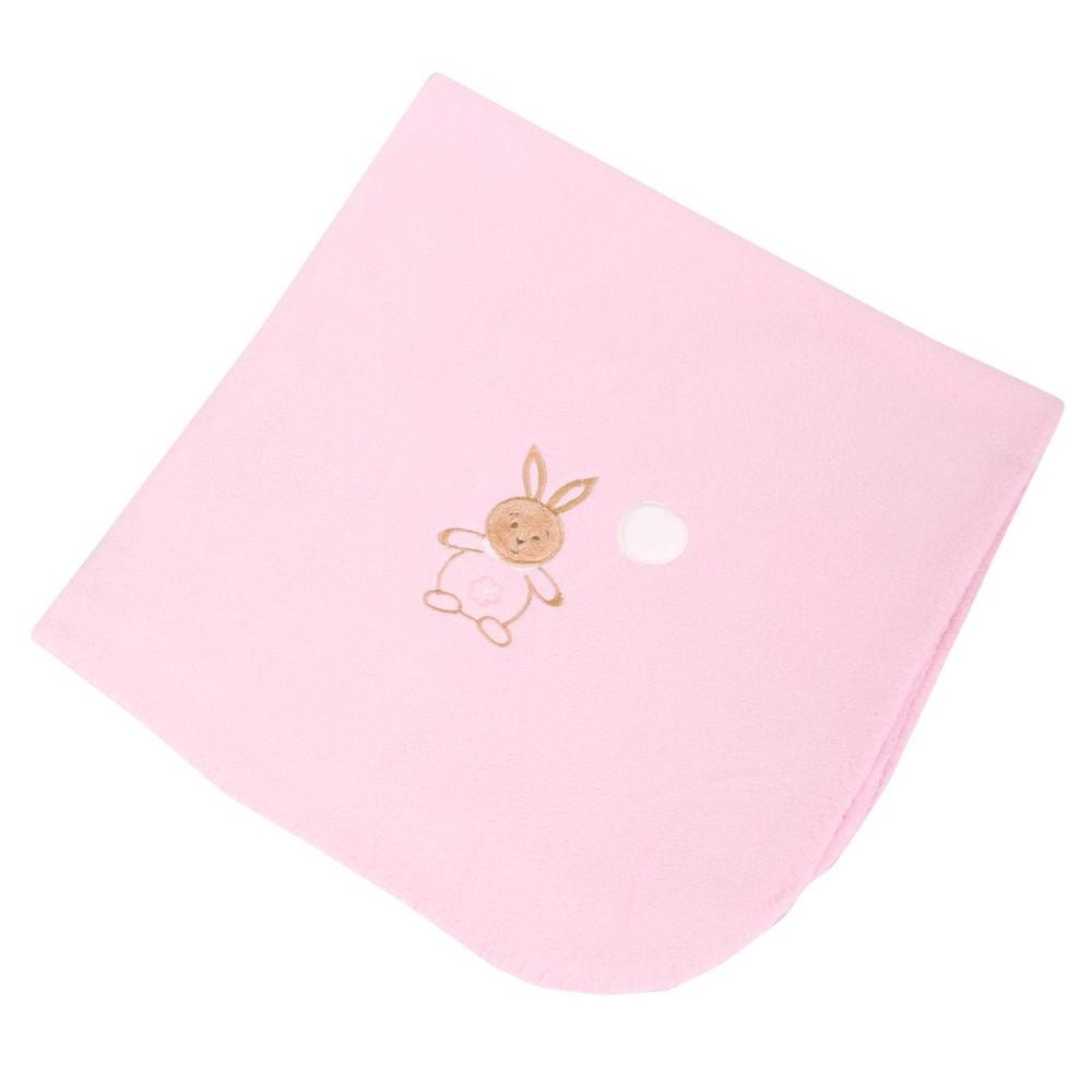 Kocyk pluszowy różowy. Miękki w dotyku kocyk pluszowy z motywem wyhaftowanego króliczka, obszyty różową nicią. Produkt zapakowany w plastikowe, przeźroczyste etui.