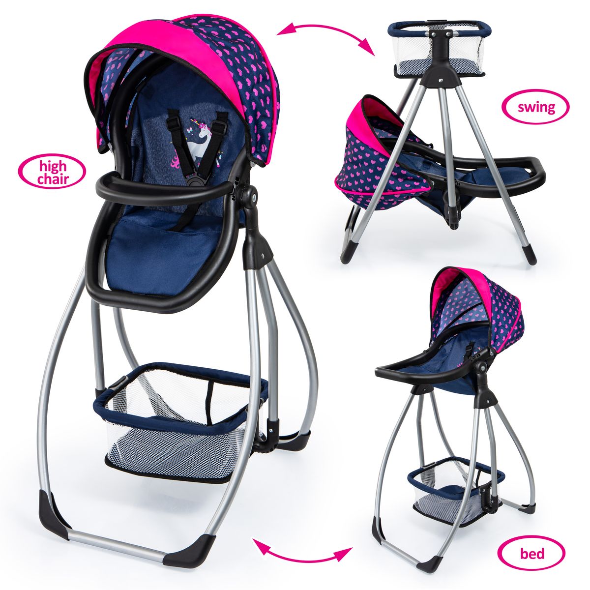 To nowoczesne kolorowe krzesełko dla lalek oferuje różne możliwości zabawy. Jest odpowiednie dla lalek do 46 cm. Może być używane do karmienia lalki w pozycji pionowej, czy do drzemki lalki w pozycji leżącej. Zintegrowana taca pozwala łatwo nakarmić maleństwo. Siedzisko krzesełka można wyjąć. Może służyć jako huśtawka dla lalki. Wymiary (cm): 37,5 x 44 x 77. Wymiary opakowania 38 x 9,5 x 49 cm.
