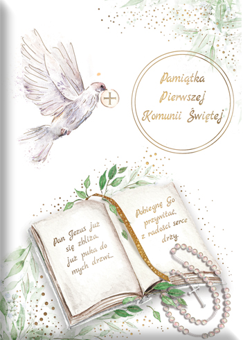 Książeczka Komunijna w formacie A5. Oprawa twarda złocona. Autorskie ilustracje, własny dobór tekstów. Książeczka 12-nasto stronicowa z kopertą na pieniążki.