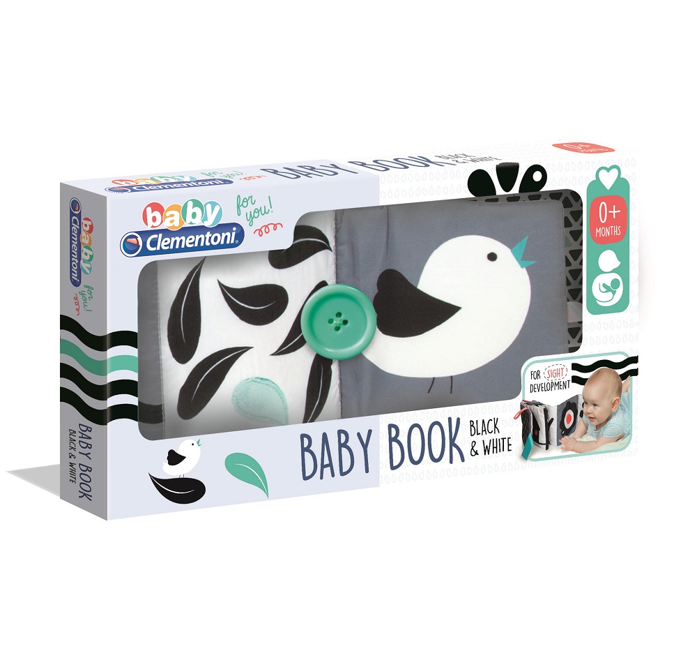 Miękka książeczka z czarno-białymi ilustracjami, które rozwijają percepcję wzrokową niemowląt w pierwszych miesiącach życia.
