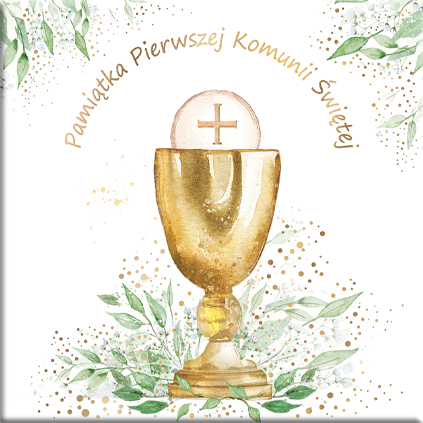 Książeczka Komunijna w formacie 21,5 x 21,5 cm. Oprawa twarda złocona. Autorskie ilustracje, własny dobór tekstów. Książeczka 12-nasto stronicowa z kopertą na pieniążki.