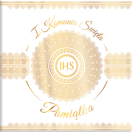 Książeczka Komunijna w formacie 21,5 x 21,5 cm. Oprawa twarda złocona. Autorskie ilustracje, własny dobór tekstów. Książeczka 12-nasto stronicowa z kopertą na pieniążki.