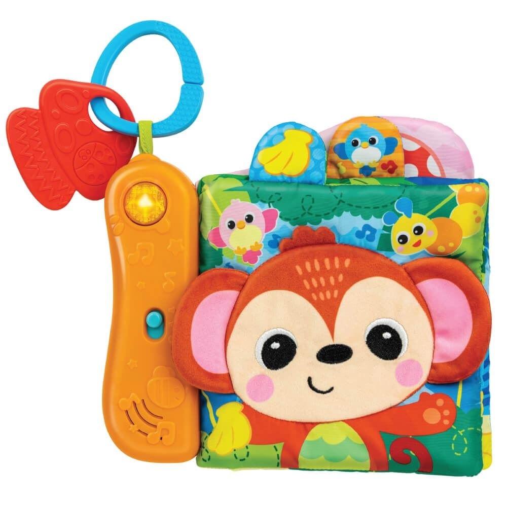Książeczka ze światłem i dźwiękami, dołączony gumowy gryzak, który można wygodnie odczepić lub przypiąć książeczkę do fotelika lub leżaczka.