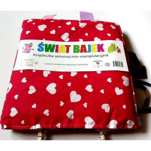 W książeczce znajdują się zabawy sensoryczno-manualne, kieszonki, przesuwane elementy, przeplatane sznureczki, ruchome kształty a także dzwoneczek wydający dźwięk. Różne faktury materiałów pobudzające zmysły i zachęcające dziecko do aktywności. Zabawy manualne w przeplatanie, dotykanie, przesuwanie.