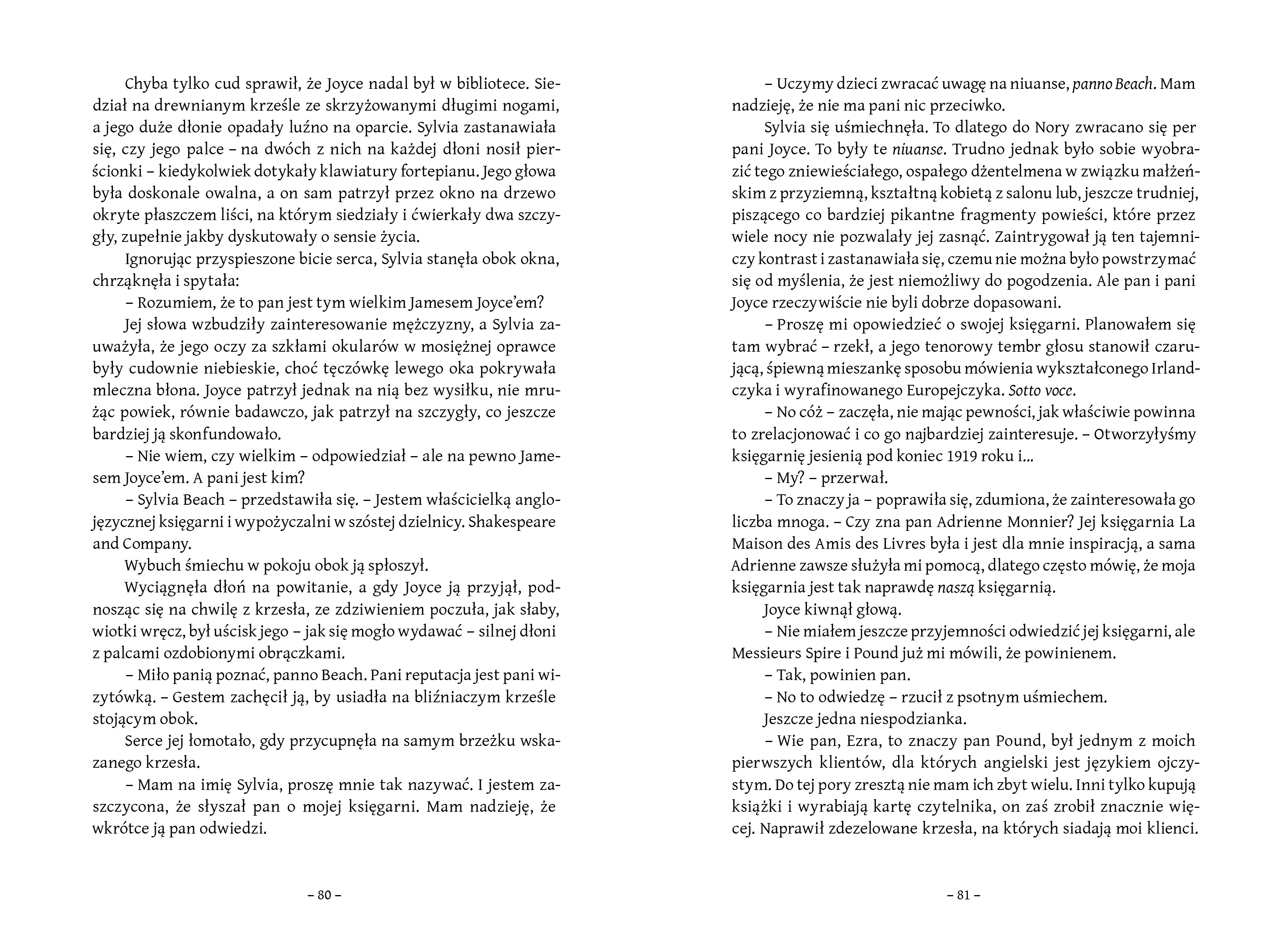Paryż, rok 1919 – miasto miłości i literatury Amerykanka Sylvia Beach przy jednej z cichych uliczek Paryża otwiera anglojęzyczną księgarnię Shakespeare and Company. Wkrótce atmosfera tego miejsca przyciąga emigracyjną bohemę. To tutaj Ernest Hemingway leczy kaca i wykłóca się z F. Scottem Fitzgeraldem, a Ezra Pound rozpuszcza plotki ze świata wydawniczego. Tylko Gertrude Stein odmawia wizyt w księgarni, ponieważ nie pała zbytnią sympatią do jej najważniejszego bywalca – Jamesa Joyce’a. Geniusz tego humorzastego Irlandczyka oczarowuje Sylvię do tego stopnia, że dla wydania jego zakazanej powieści ryzykuje wszystko – księgarnię, pieniądze i reputację. To dzięki niej świat może przeczytać Ulissesa – obsceniczne arcydzieło XX wieku. Nawet jeżeli ceną ukazania się powieści jest utrata przyjaźni z Joyce’em. Kerri Maher napisała powieść dla wszystkich, którzy kochają zapach książek i nie mogą się powstrzymać od spędzania długich godzin w otoczeniu wypełnionych nimi regałów. Idealnie uchwyciła klimat najpopularniejszej księgarni świata i oddała hołd kobiecie, która poświęciła swoje życie literaturze. Powieść oparta na prawdziwych wydarzeniach.