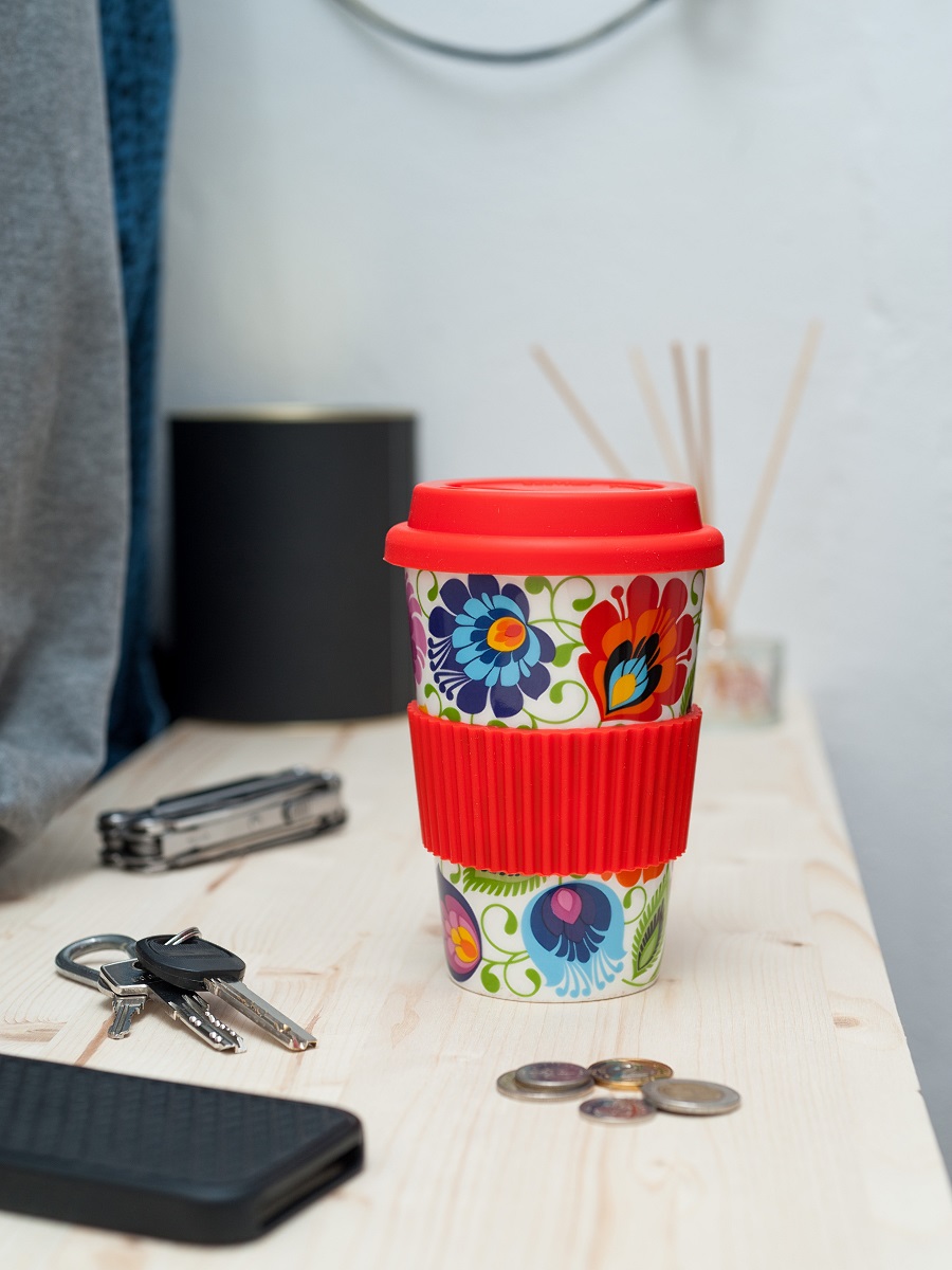 Łowicki kubek termiczny - biały: ceramiczny z nadrukowanym kwiatowym wzorem łowickim na białym tle,wzór ludowy znajduje się na całej powierzchni kubka,posiada silikonową czerwoną obręcz chroniącą przed poparzeniem,