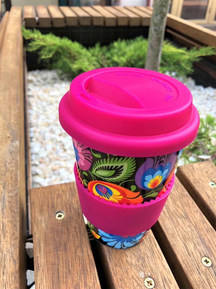 Łowicki kubek termiczny - czarny: ceramiczny z nadrukowanym kwiatowym wzorem łowickim na czarnym tle, wzór ludowy znajduje się na całej powierzchni kubka,posiada silikonową ciemnoróżową obręcz chroniącą przed poparzeniem, z wygodnym silikonowym wieczkiem, umożliwiającym picie z dziubka,pojemność 350 ml,higieniczny i łatwy do mycia, można myć w zmywarce,ozdobne pudełko w zestawie gotowy prezent,sprawdzi się na prezent lub jako pamiątka z Polski.