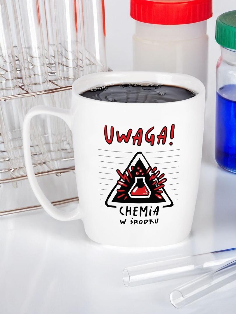 CHEMIA W ŚRODKU to nie jest ostrzeżenie, ale zapowiedź... Bo jeśli ktoś potrafi rozkręcić klasę, przeprowadzić doświadczenie i jeszcze zaparzyć herbatę między jednym wzorem a drugim – to zdecydowanie zasługuje na ten kubek i odznaczenie. Jeśli szukasz pomysłu na prezent na zakończenie roku szkolnego lub Dzień Nauczyciela – ten kubek jest idealny!