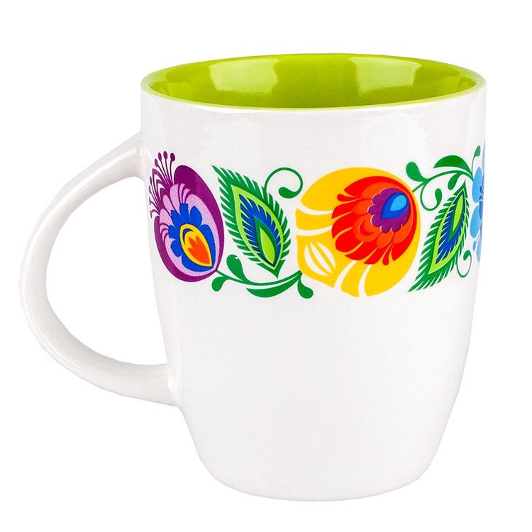 Kubek folk design z kolorowym wnętrzem i oryginalnymi wzorami kwiatowymi dookoła. Zdobienie na kubkach stylizowane jest na ludowo - wzorowane na motywach z tradycyjnych wycinanek łowickich, których podstawowymi elementami są motywy kwiatowe, koguty i pawie.