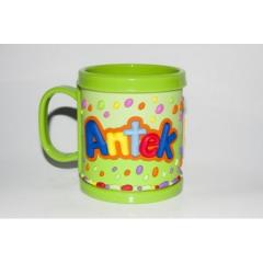 Plastikowy kubek imienny dla dziecka, na zewnątrz pokryty antypoślizgową gumą. Posiada wygodny duży uchwyt do trzymania. Idealny do domu, przedszkola lub na wyjazdy.