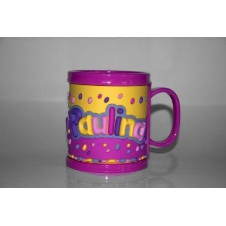 Plastikowy kubek imienny dla dziecka, na zewnątrz pokryty antypoślizgową gumą. Posiada wygodny duży uchwyt do trzymania. Idealny do domu, przedszkola lub na wyjazdy.