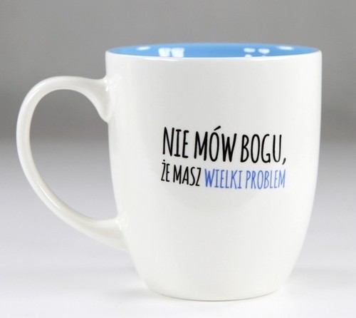 Z jednej strony kubka znajduje się napis: Nie mów Bogu, że masz wielki problem.A z drugiej strony: Powiedz swojemu problemowi, że masz Wielkiego Boga.