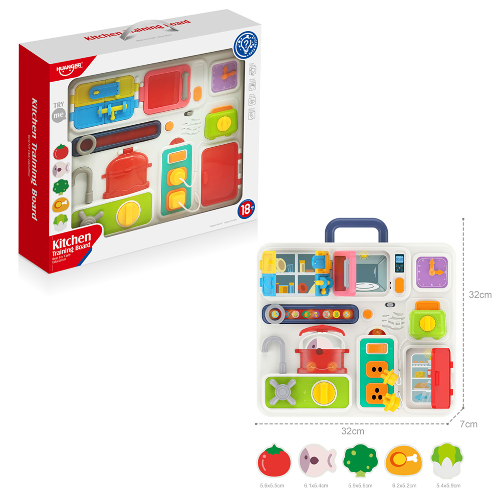 Kuchnia dla maluchów - tablica manipulacyjna Ruchome elementy do otwierania, przekręcania, dopasowywania, które usprawniają motorykę małej rączki i paluszków. Dodatkowo efekty świetlne i dźwiękowe urozmaicają zabawę. 5 plastikowych kształtów - pomidor, ryba, mięsko, brokuł, sałata wygodna rączka do przenoszenia wymiar tablicy manipulacyjnej - 32 x 7 x 32 cm zasilanie: 3xAA (brak w zestawie) Wiek: 18m+ Wymiary opakowania: 37x8x33 cm