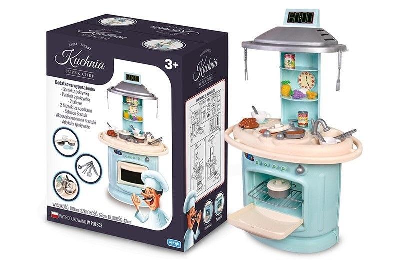 W zestawie: garnek z pokrywką, patelnia z pokrywką, 2 talerze, 2 filiżanki ze spodkami, sztućce 6 szt, akcesoria kuchenne 4 szt, art. Spożywcze, owoce, Wymiary po złożeniu: 100 x 62 x 42 cm. Wymiary opakowania: 49 x 63 x 33 cm. Dla dzieci w wieku: 3+