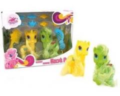 Zestaw dwóch plastikowych koników Poli z akcesoriami do włosów.