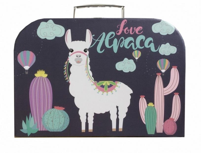 Kuferek duży, kartonowy, zamykany na metalowy zatrzask.