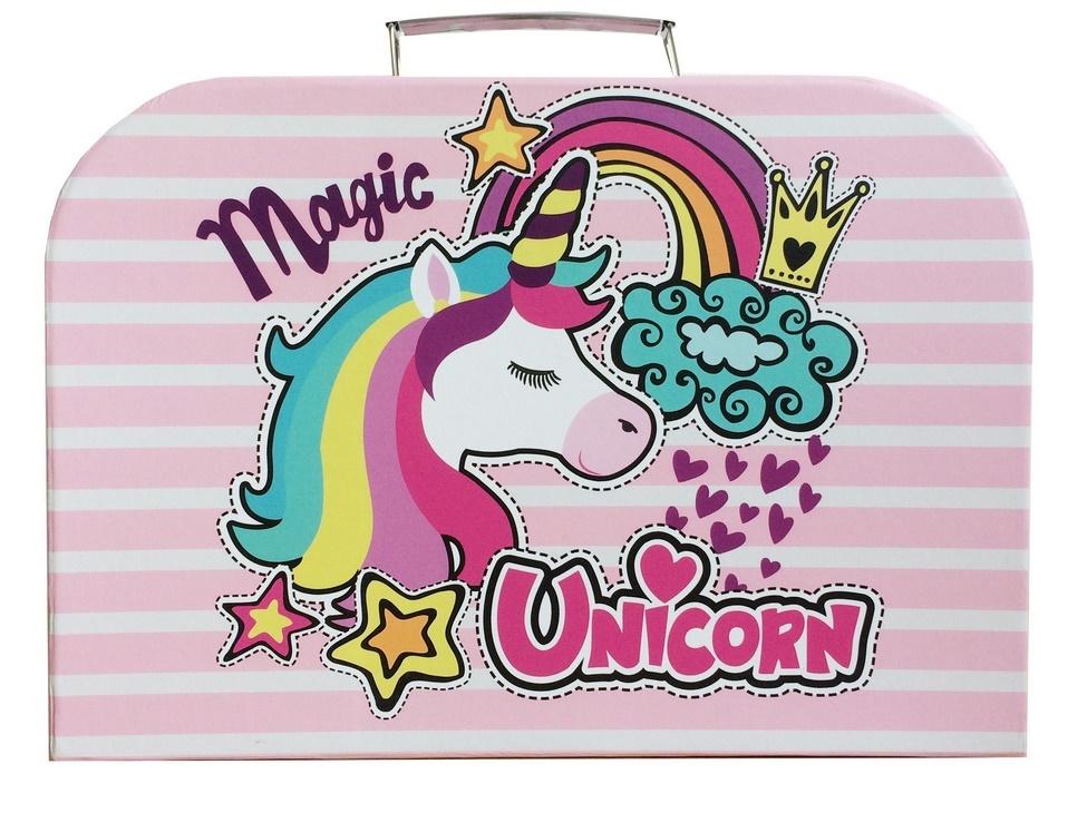 Kuferek duży, kartonowy, zamykany na metalowy zatrzask, z wygodną rączką do trzymania.
