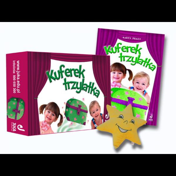 Kuferek trzylatka zapewnia wszechstronny rozwój każdego dziecka rozpoczynającego swoją przygodę w przedszkolu. Pakiet budzi ciekawość dzieci otaczającym światem, a także rozwija samodzielność i kompetencje społeczne. Postacią przewodnią pakietu jest wróżka, w rolę której wciela się nauczyciel. Dzięki baśniowej atmosferze nauczyciel stwarza dogodne warunki do odkrywania i poznawania otaczającego dziecko świata społecznego, przyrodniczego i technicznego.W kolorowym pudełku dziecko znajdzie oprócz barwnych i wielotematycznych kart pracy także zestaw laminowanych kart z naklejkami wielokrotnego użytku, płytę z grami interaktywnymi oraz przyjazną dla dziecka gwiazdkę, pełniącą funkcje poduszki i służącą zabawom edukacyjnym. Nowością w pakiecie są Kuferkowe kolorowanki edukacyjne dla najmłodszych rozwijające wrażliwość plastyczną dzieci, logiczne myślenie oraz motorykę małą.Skład pakietu Kuferek trzylatka: Karty pracy Kuferkowe kolorowanki edukacyjne dla najmłodszych - NOWOŚĆ Karty laminowane A4 z naklejkami wielokrotnego użytku Gry interaktywne dla trzylatka (CD-ROM) Gwiazdka przytulanka.