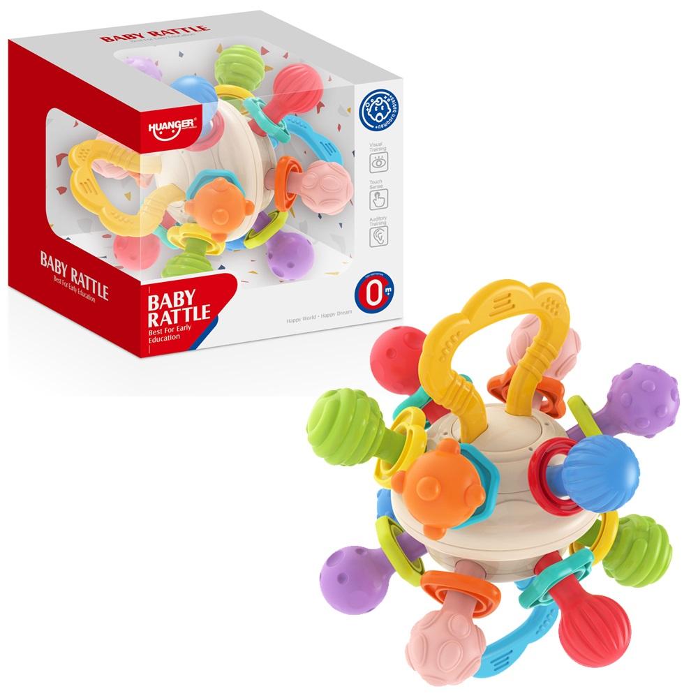 Kula z silikonowymi wypistkami do gryzienia. Można ją przekręcać wzdłuż własnej osi. Wymiary opakowania: 13x11.5x10.5 cm.