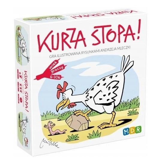 Robaczki opanowały podwórko i bawią się z kurką w ciuciubabkę. Tak dalej być nie może! Pomóż kurce wyłapać robaczki, bo sama sobie nie radzi. W odpowiednim momencie krzycz: „Kurza stopa!”, aby zgarnąć je wszystkie ze stołu. KURZA STOPA! to gra dla całej rodziny; liczą się w niej refleks i spostrzegawczość.