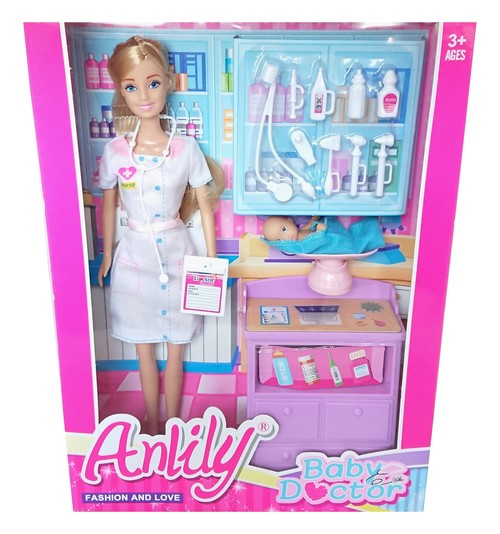 Lalka Amlily lekarka z niemowlakiem i kompletem akcesoriów.