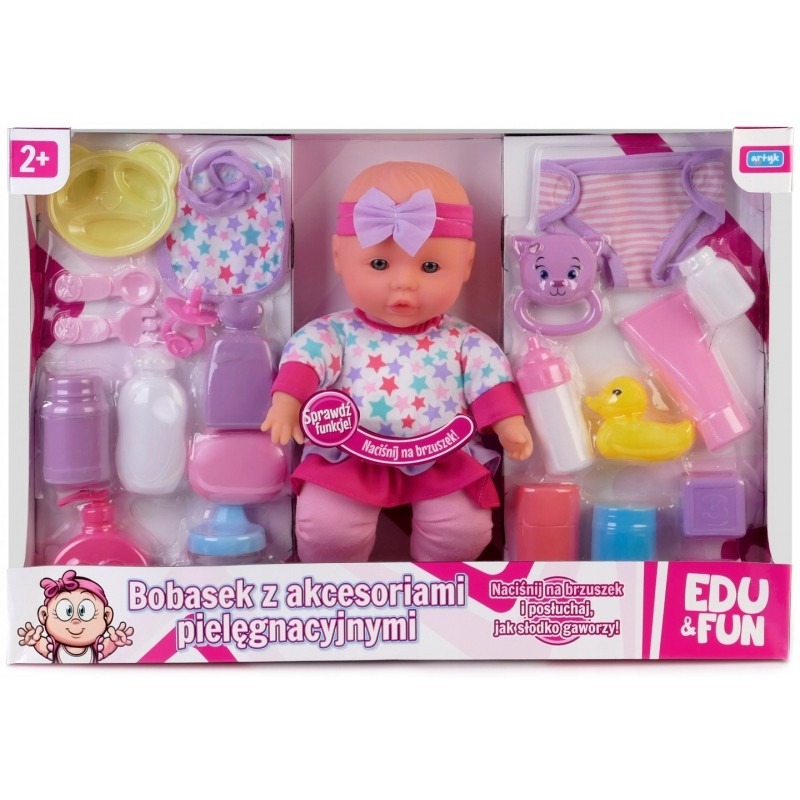 W ZESTAWIE: LALKA 32 CM., AKCESORIA: TALERZYK, SZTUĆCE, ŚLINIACZEK, SMOCZEK, 2 BUTELKI, GRYZAK, KACZUSZKA, PIELUSZKA, ZESTAW 9 KOSMETYKÓW, 2 KOSTKI, FUNKCJE: PO NACIŚNIĘCIU NA BRZUSZEK LALKA GAWORZY, WYM. OPK. 48 X 33 X 10 CM., BETERIE: 1 X CR 2032 3,2V, ZAŁ. DEMONSTRACYJNE, 2+